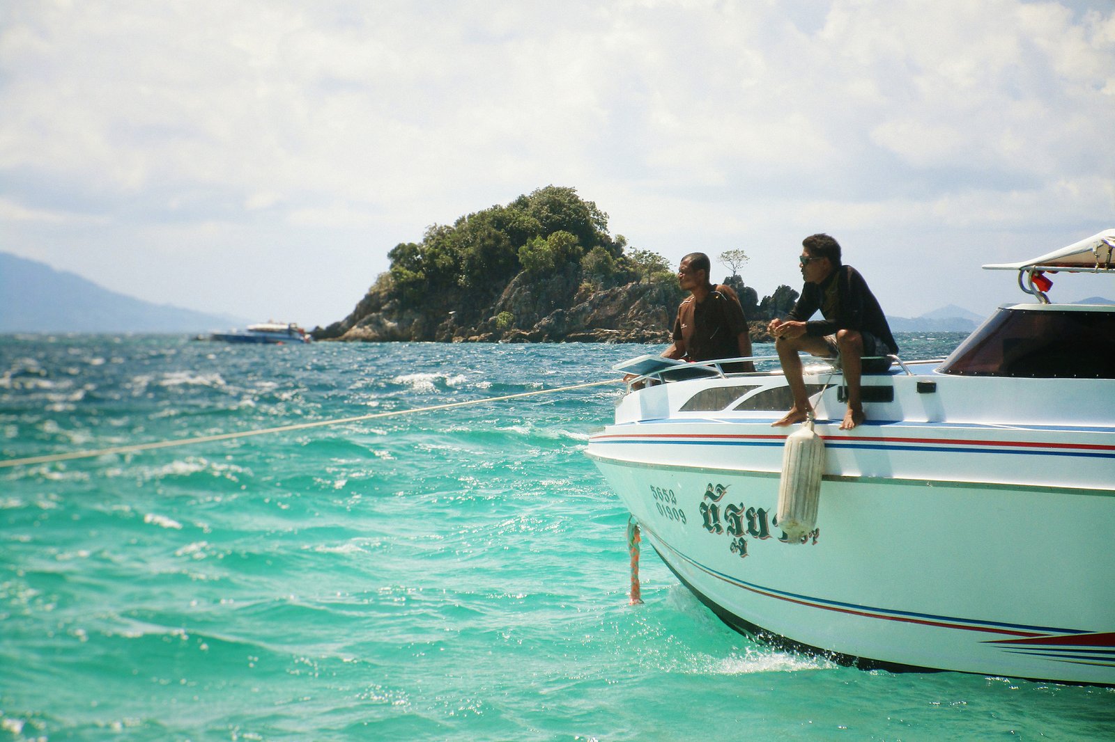 Море сегодня неспокойно, и гид поясняет, что обычно дорога занимает 30 минут, но сегодня будет чуть дольше. Мы выскакиваем из бухты Сапан на высокой волне и берём курс на юго-восток. К северу находится красивый остров Ранг-Яй с его жемчужной фермой, а оглянувшись, мы видим радиомачты и холмы с видом на Пхукет-Таун.