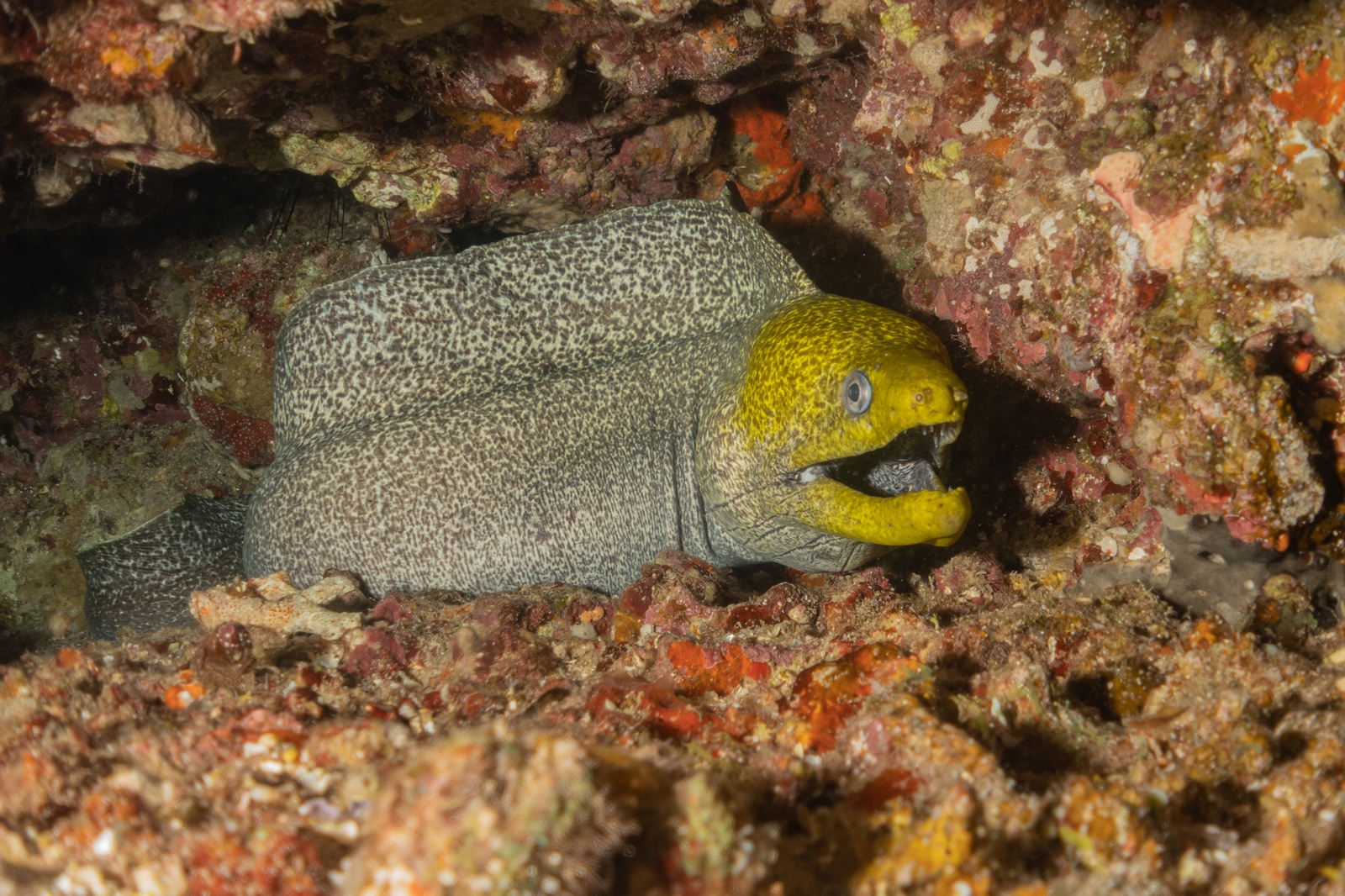 Мурены – еще одни фотогеничные обитатели Хин Клай. Днем они высовывают головы из щелей, приоткрывая пасть – не потому, что злятся, а просто так они дышат, прогоняя воду через жабры. Самый частый вид здесь – гигантская мурена (Gymnothorax javanicus), коричневая с черными пятнами. Встречаются и более яркие виды, но реже.
